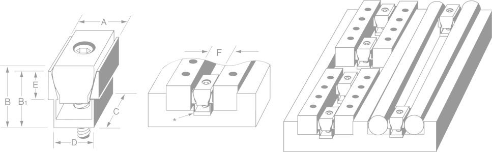 F† The distance needed between workpieces for clamp clearance. Drill and tap mounting hole on the center of F dimension.